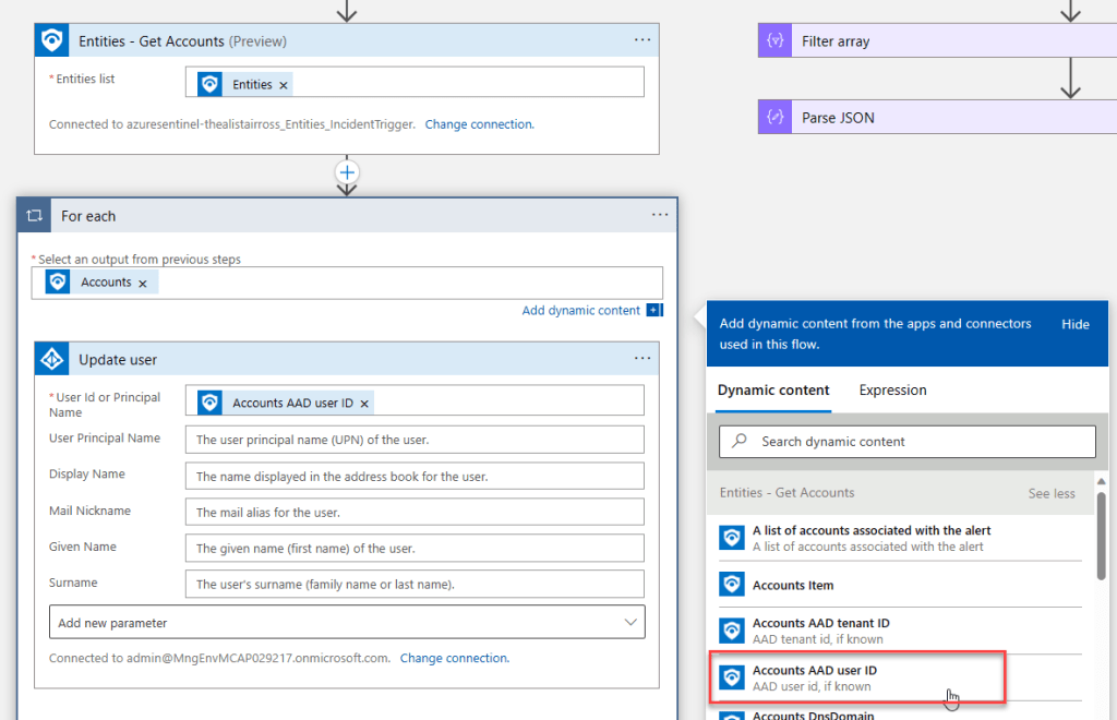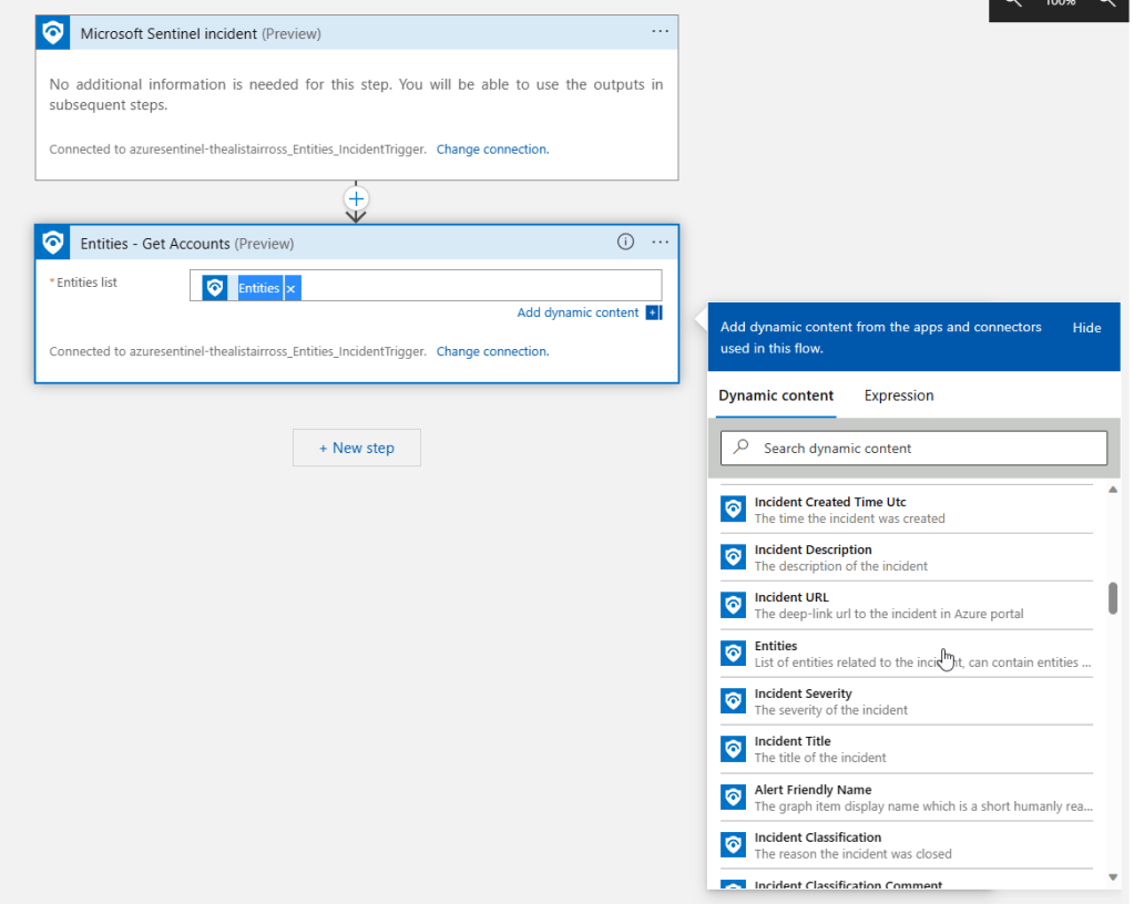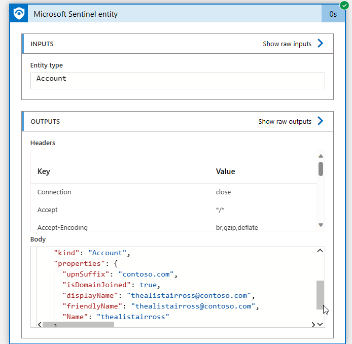 Now the trigger has the details of the entity which you can use in subsequent steps. It also provides the incident ARM Id, so you can correlate it with the incident you triggered it from.