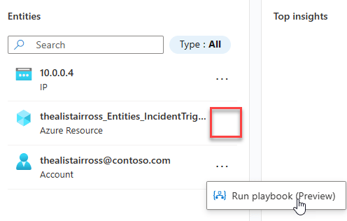 Now I hear you say, what happens if I run a playbook designed for an account entity for a different type of entity. Short answer, you cannot. To run an entity playbook, you need to select the entity within the incident overview blade. In my example below, I have three entities, an account, an IP address and an azure resource. Because account and IP address are supported for entity triggers at this time, both have the ellipses which you can select Run playbook, therefore I cannot run it for the azure resource.