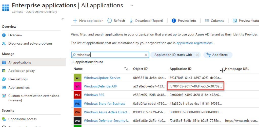 If you navigate to Azure Active Directory, then Enterprise Applications and ensure there are no filters applied, you can search for the application here. In my example below, you can see I have searched for “Windows” and WindowsDefenderATP is listed (which is the permission I want), which has an application Id of fc780465-2017-40d4-a0c5-307022471b92.