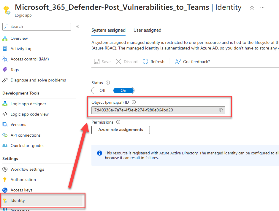 The $ObjectId can be found in Azure Active Directory, but for managed identities, they are more easily found under the Identity pane of the resource under “Object (principal) ID” as shown below.