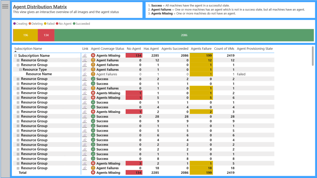 This report aims to shows the agent coverage across your subscriptions, with drill down capabilities to the resource level. The Agent Coverage Status provides a roll up status of the worst status.