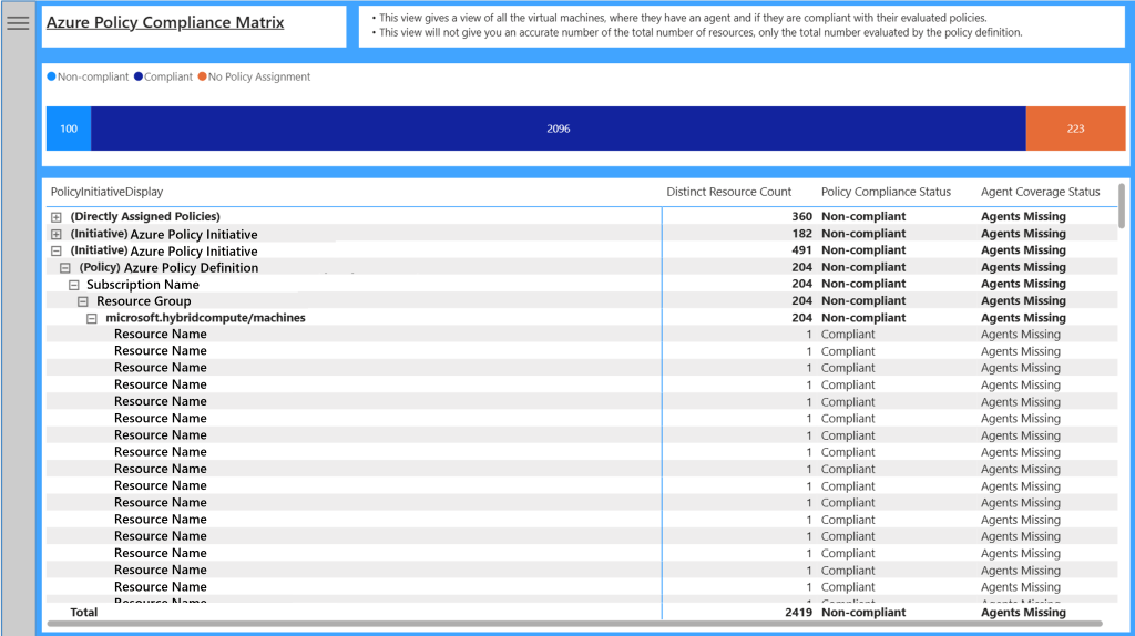 This report will show the agent coverage, as well as the Azure Policy Compliance status, with the added “No Policy Assignment” to identify any machines that are not covered by a policy. It will help you find policies that are potentially miscofigured or need a remediation task running to deploy the agents.